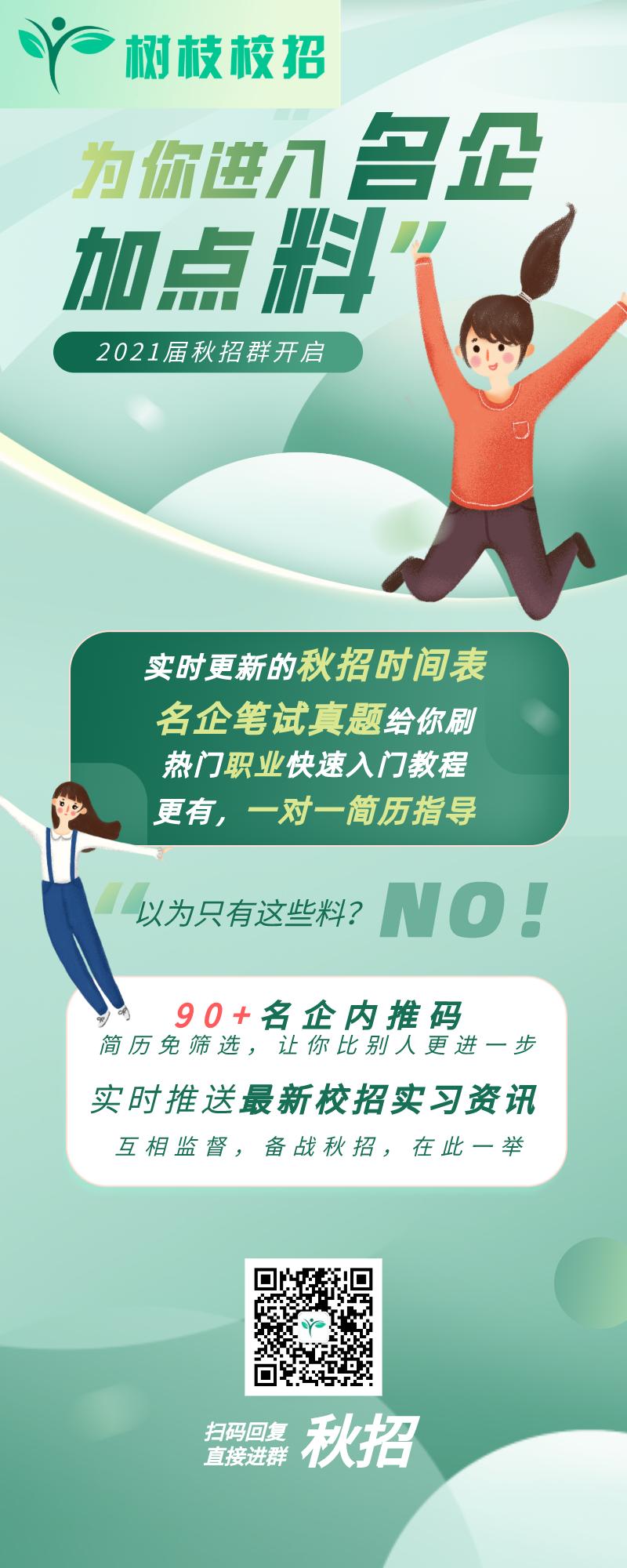 树枝校招,是专注于大学生成长与就业的招聘平台。自2017年开始,树枝校招已经在上海、安徽、武汉、长沙等地举办了数百场线上线下校园招聘活动,并为大学生提供海量的校招/实习资讯、内推、求职干货及职前辅导等,帮助数十万大学生拿到了理想左边offer右边。微博@树枝校招。我们欢迎各种形式的合作,校园招聘合作请添加微信:pyd,校园活动、品牌推广合作、招聘信息发布等请添加微信:st。(添加时请备注:品牌名-姓名-合作意向)。上海也开始抢人了