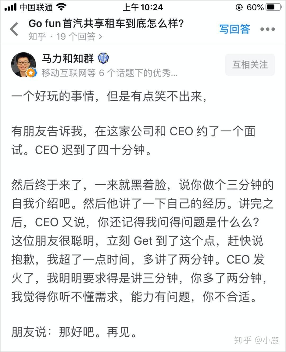 还有@马力和知群老师分享的一位朋友去Gofun首汽共享租车面试(CEO直面),结果成了一次很不愉快的经历。
