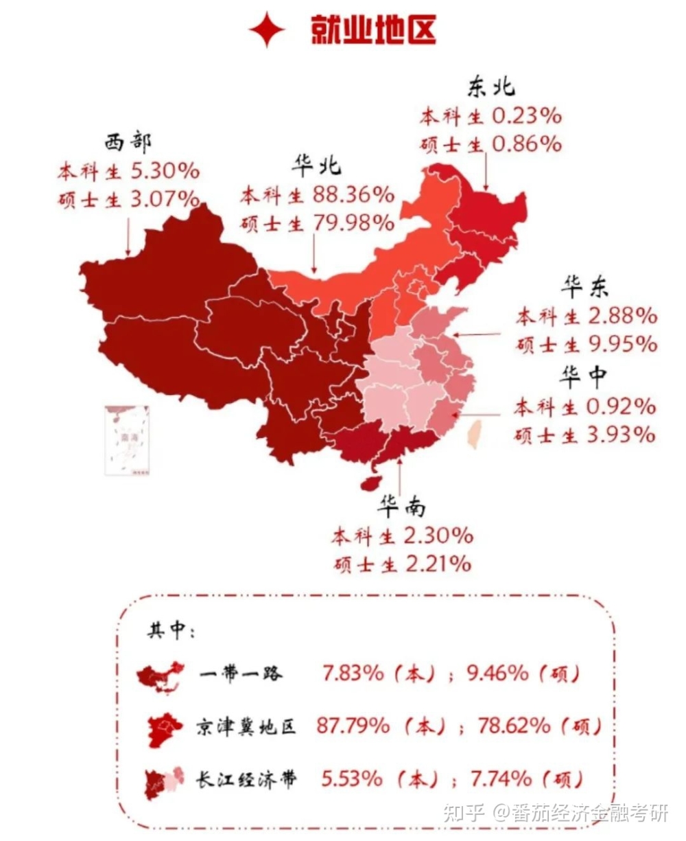 首经贸毕业后岗位倾向于华北地区、华中地区,流向中西部地区的较少。