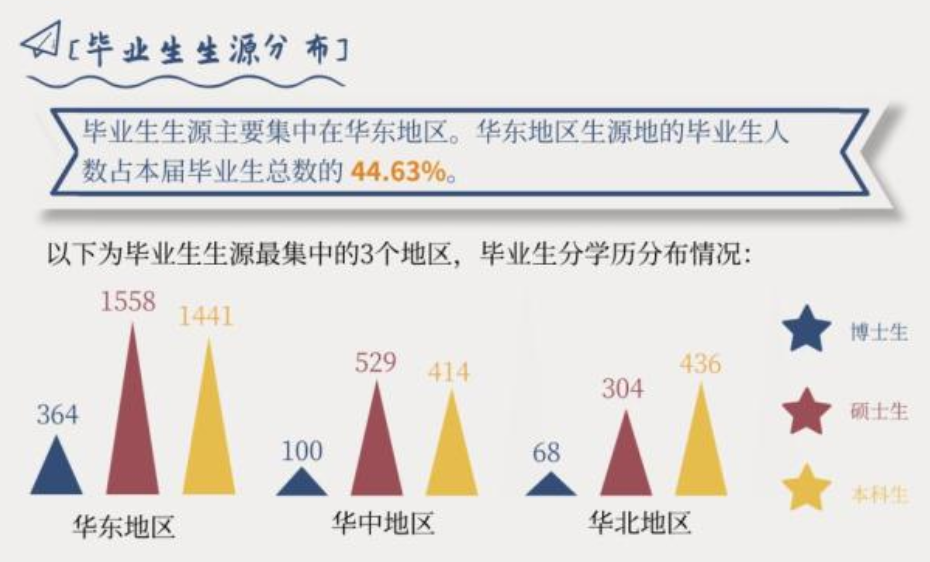 据同济大学2019届毕业生就业质量报告,该校2019年毕业生总数为7535人,其中,博士毕业生648人,硕士毕业生3087人,本科毕业生3800人。毕业生生源主要集中在华东、华中、华北地区,其中生源为华东地区的毕业生最多。