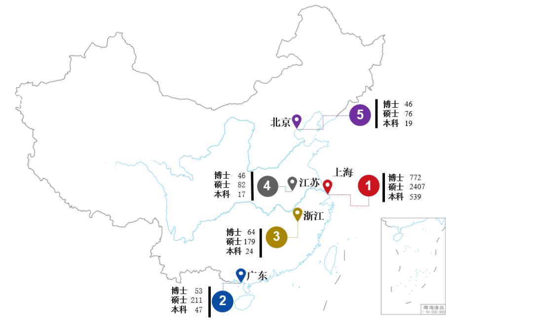 上海交通大学2019年毕业生共8944人(不含港澳台及留学生),其中博士生1352人,硕士生4035人,本科生3557人。从就业地域来看,上海交通大学毕业生主要就业省市为上海市,博士生、硕士生和本科分别为772人、2407人和539人。除上海市外,毕业生就业人数较多的省市依次有:广东省、浙江省、江苏省和北京市。毕业生总体更倾向于在东部地区就业。