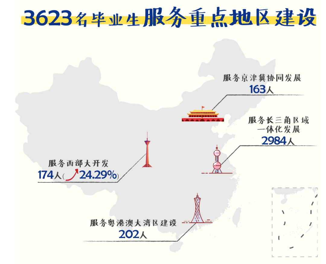 据复旦大学2019年毕业生就业质量报告显示,该校2019届毕业生总人数达7726人,其中本科生2542人、硕士生3782人、博士生1402人。其中,3623名毕业生奔赴西部地区、长江三角洲地区、粤港澳大湾区、京津冀地区等重点地区就业,服务国家区域发展战略,选择长江三角洲地区的毕业生有2984人,数量最多。