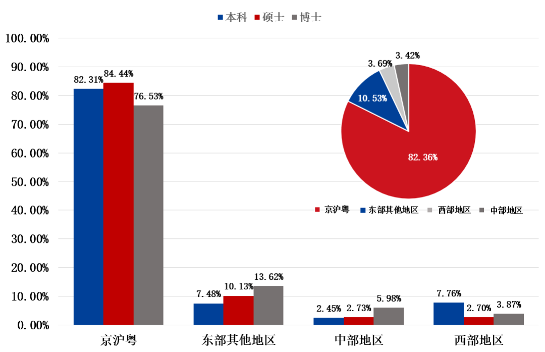 华东师大2019届毕业生共6891人,包括本科生3249人、硕士3112人、博士529人,另有高职学历1人。从就业地域分布看,超过八成毕业生选择在东部地区就业。其中,长江三角洲地区就业比例高达72.87%,留沪就业比例为61.49%。另外,前往东北地区就业的比例最低,仅为0.57%。