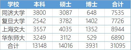 每经小编(左边微信号右边:左边nbdnews右边)根据各校的2019年毕业生就业质量报告统计,上述四所高校2019年本科生毕业总数为人,本硕博毕业生总数为人,即便剔除整体占比较小的上海本地生源,那么这4所高校能落户上海的总人数至少破万,甚至更高。
