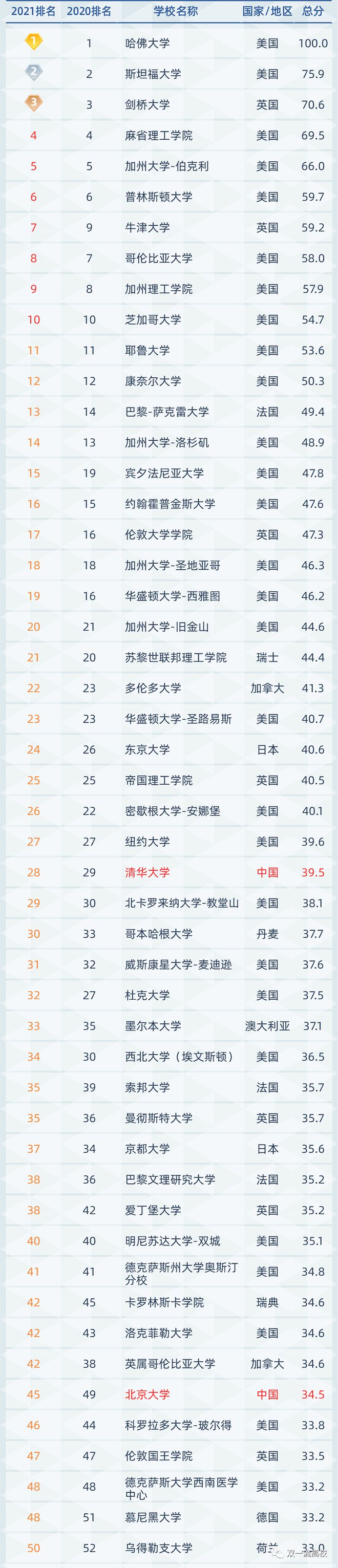 2021上海软科世界大学学术排名top50