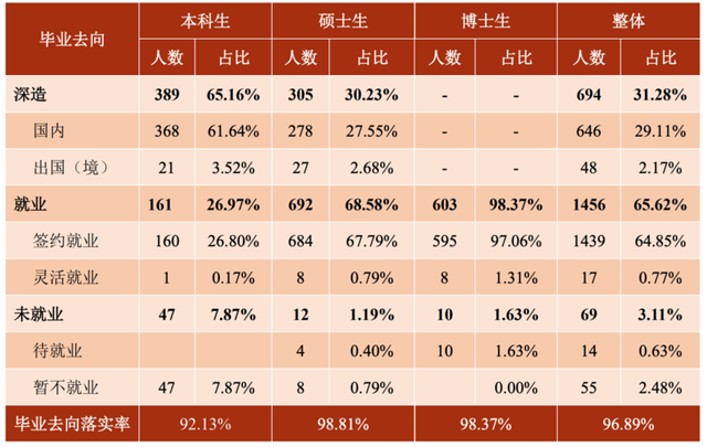 其中校本部2021届毕业生毕业去向落实率为98.50%,本科生毕业去向落实率为97.14%,硕士生毕业去向落实率为99.34%,博士生毕业去向落实率为99.50%。国内深造比例为25.32%,出国(境)深造比例为8.91%;就业比例为64.27%,其中签约就业比例为59.67%。