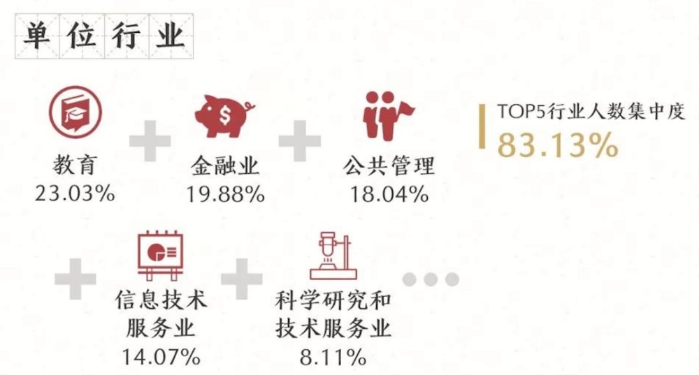 北大今年就业的一大特点是重点地区就业人数在增加,包括“一带一路”相关地区、京津冀地区和长江经济带比重均占有较大比重。而从行业来看,则其中集中在教育、金融、公共管理等领域。