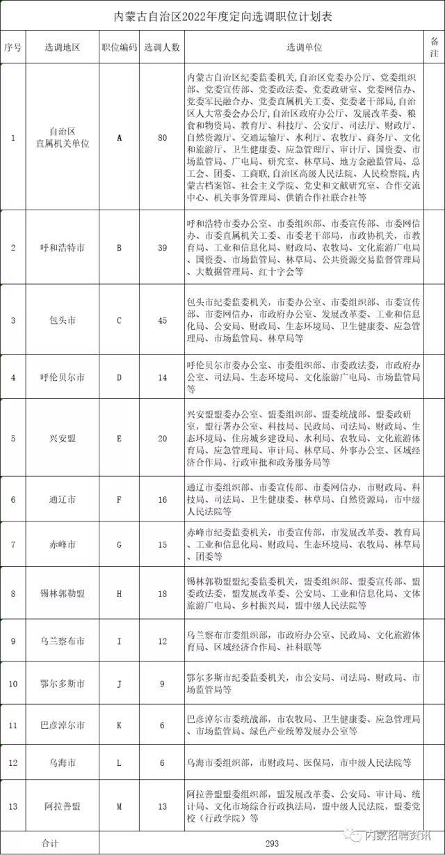 计划选调2022年全日制应届大学本科及以上学历学位毕业生293名。其中自治区直属机关单位80名,盟市直属机关单位213名(具体见附件1)。定向培养(不含少数民族高层次骨干人才培养计划应届毕业生)、委托培养、成人教育、在职教育和独立学院应届毕业生不列入选调范围。