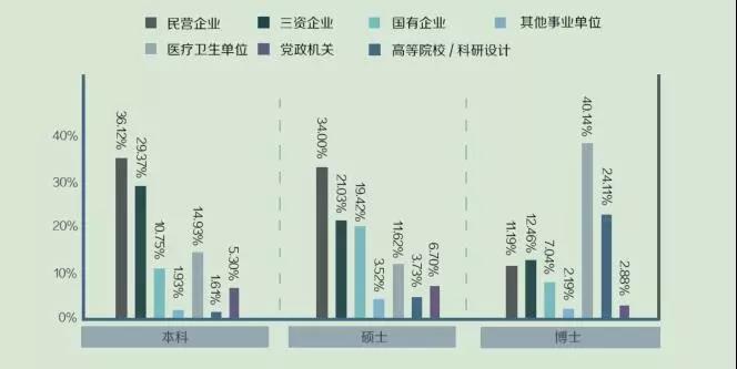 按学历层次统计,本科和硕士毕业生就业单位性质分布皆主要集中于各类企业和医疗卫生单位,分别占本科毕业生就业人数的76.24%和14.93%,占硕士毕业生就业人数的74.44%和11.62%。博士毕业生就业单位性质分布主要集中于医疗卫生单位和高等学校/科研设计,分别占博士毕业生就业人数的40.51%和24.11%