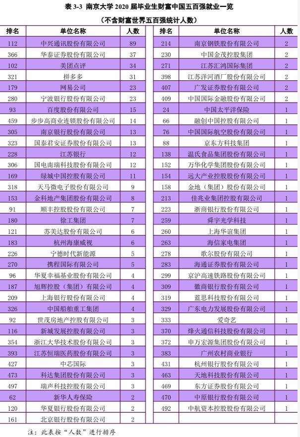 南京大学2020届毕业生去到世界500强企业人数一览: