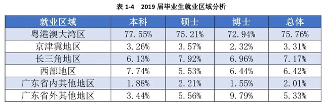 报告显示共有4788名毕业生在粤港澳大湾区就业,留在大湾区比例为75.76%;406人去到西部就业,占比6.42%;209人去到京津冀地区就业,占比3.31%;去往长三角占比7.17%;