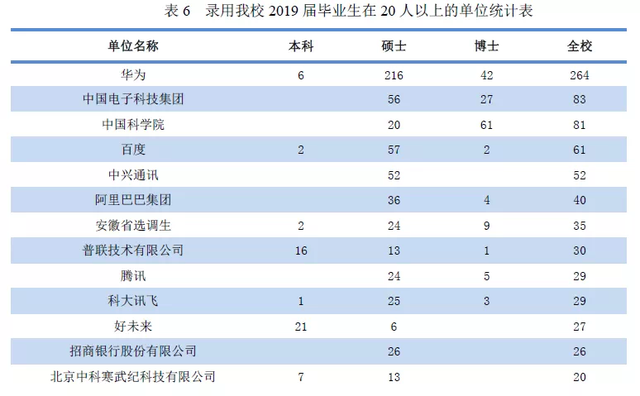 2019届毕业生去华为最多,人数为264人;其次是到中国电子科技集团83人,到中国科学院81人,到百度61人,到中兴通讯52人,到阿里40人,此外还有:到腾讯29人、科大讯飞29人。