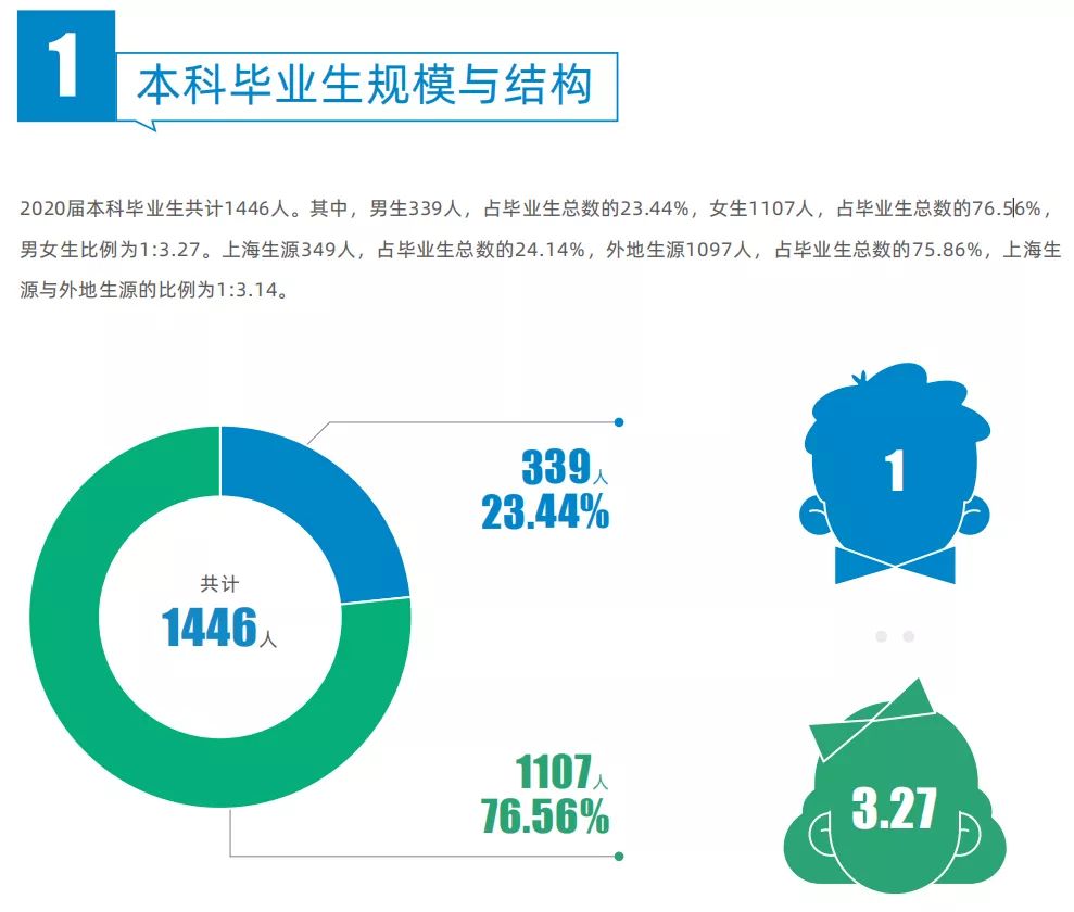 2020届毕业生共计2945人,本报告涉及毕业生数据2227人(不包含718名国际学生和港澳台学生)。其中,本科毕业生1267人,占毕业生总数的56.89%,硕士毕业生883人,占39.65%,博士毕业生77人,占3.46%;男生438人,女生1789人,男女比例为1:4;北京生源345人,京外生源1882人,京内外生源比为1:6。