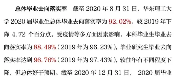 对比往年就业质量年度报告初次就业状况统计数据截止时间,截至2020年10月31日,我校2020届毕业生落实率为96.05%,较8月31日提高1.35个百分点。其中,就业比例为63.76%,国内升学比例为16.03%,出国(境)留学比例为16.26%。从学历层次来看,本科毕业生落实率为96.76%,硕士毕业生落实率为94.68%,博士毕业生落实率为100.00%。