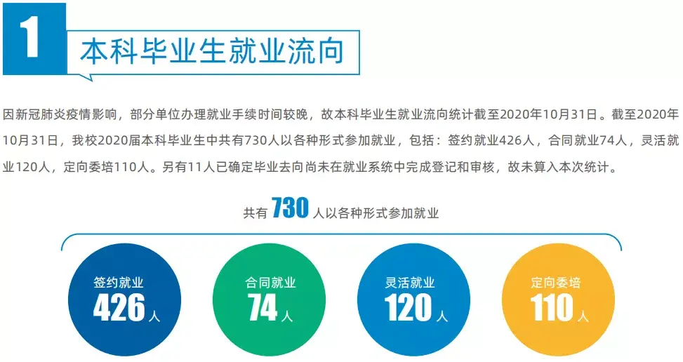 截至2020年11月30日,全校就业率达到97.60%,毕业生赴重点行业及赴基层就业数均创历史新高,到中西部、基层和国家重要行业关键领域就业的比例达69.53%,就业引导率稳步上升。