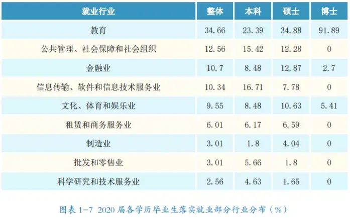 2020届毕业生中,具体就业单位行业分布排名前三的分别是教育业(34.66%),公共管理、社会保障和社会组织(12.56%),金融业(10.70%)。
