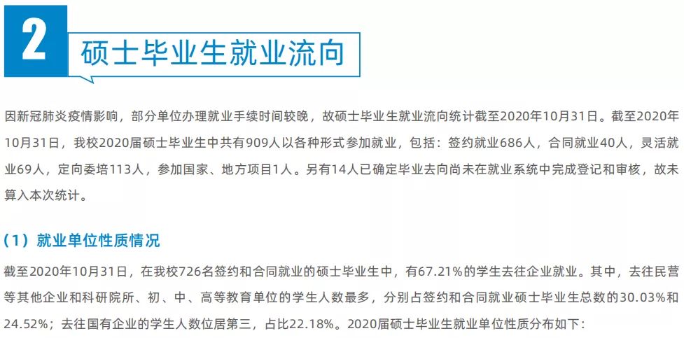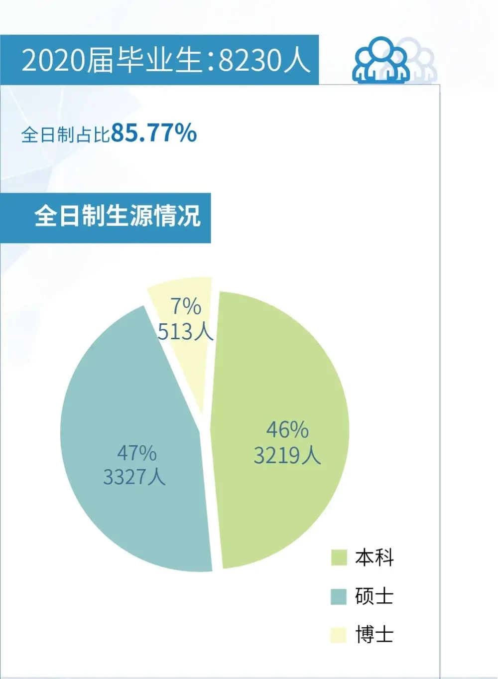 2020届毕业生总数为9384人。其中,博士毕业生687人,硕士毕业生4859人,本科毕业生3838人;全日制毕业生7843人,非全日制毕业生1541人。