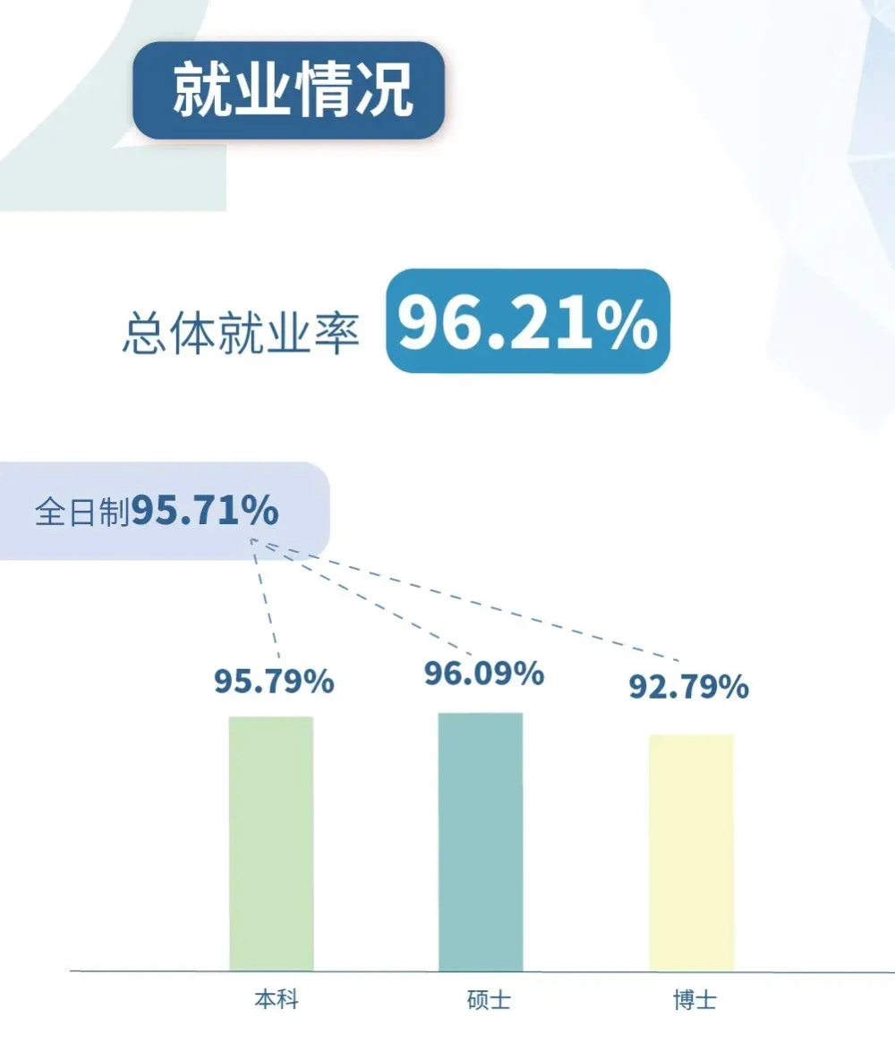 校本部就业率为97.62%,本科、硕士和博士毕业生就业率分别为95.08%、99.17%和99.76%。从毕业去向分布来看,以签约就业(含博士后)为主,占比为60.76%;其次是国内升学(21.95%)和出国(境)深造(11.57%);还有3.34%的毕业生选择灵活就业。