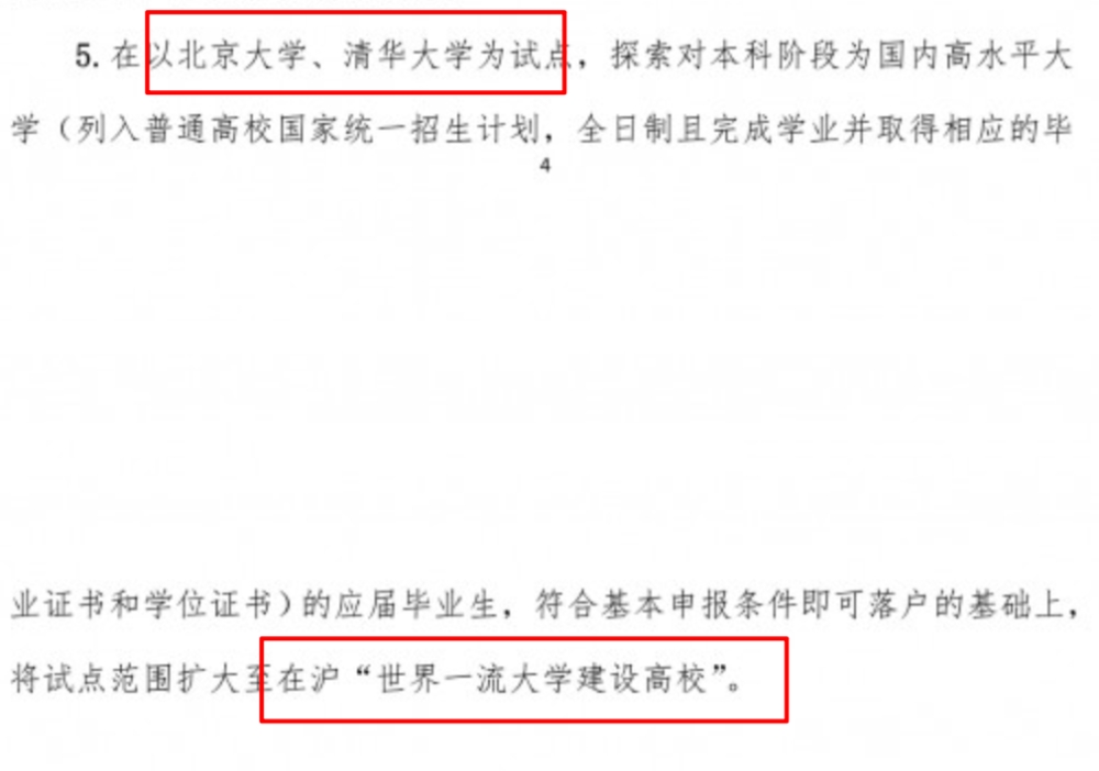 将之前“以北京大学、清华大学为试点,探索建立对本科阶段为国内高水平大学的应届毕业生,符合基本申报条件即可落户”的政策,范围扩大至在沪“世界一流大学建设高校”。