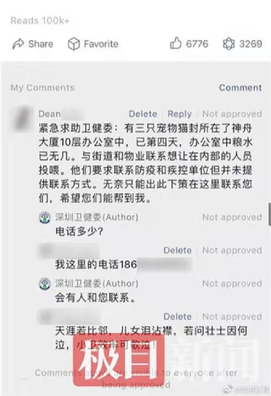 1月10日,有市民在深圳卫健委文章下留言求助,说自己有三只宠物猫,被封在了神州大厦10层办公楼中,已经第四天了,办公室中的粮水所剩无几。