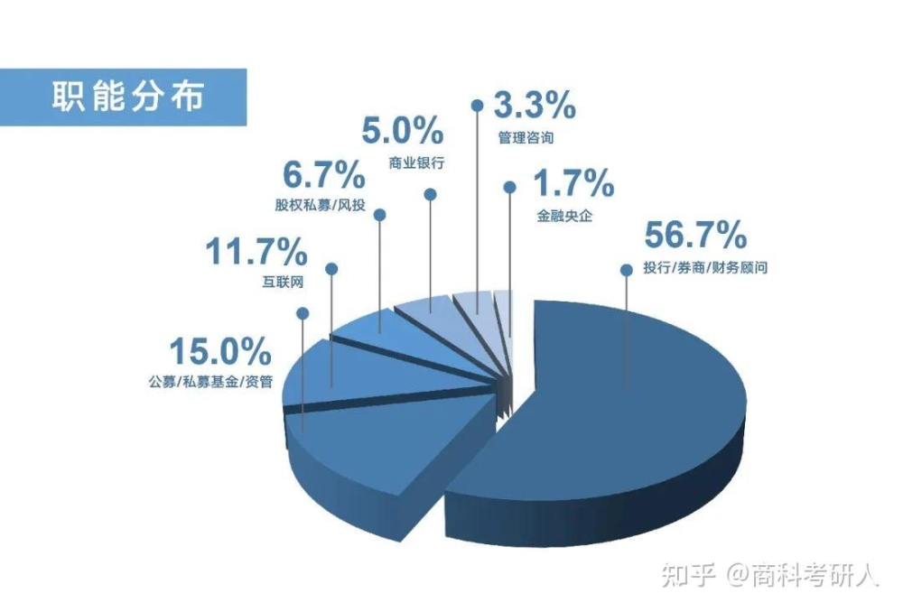 从金融行业的职能分布上来看,56.7%同学加入投行/券商/财务顾问,15.0%同学加入公募/私募基金/资管,11.7%同学加入互联网,6.7%同学加入股权私募/风投,5.0%同学加入商业银行,3.3%同学加入管理咨询,还有1.7%同学加入金融央企。