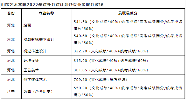 艺术史论专业初选合格的考生,高考成绩达到所在省份本科文史类一批线,文化课相对成绩山东不低于127.49、河北不低于126.88、江苏不低于119.81、其他省份不低于115.88可予录取。