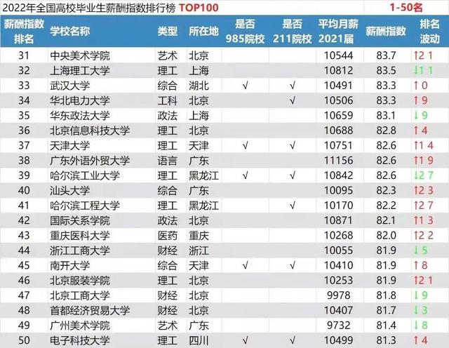 这是薪酬榜排名第31~第50的大学名单,艺术院校中的北京电影学院、中央美术学院、北服、广美也进入了前50以内。此外上海市的上海理工大学、华东政法大学也上榜。