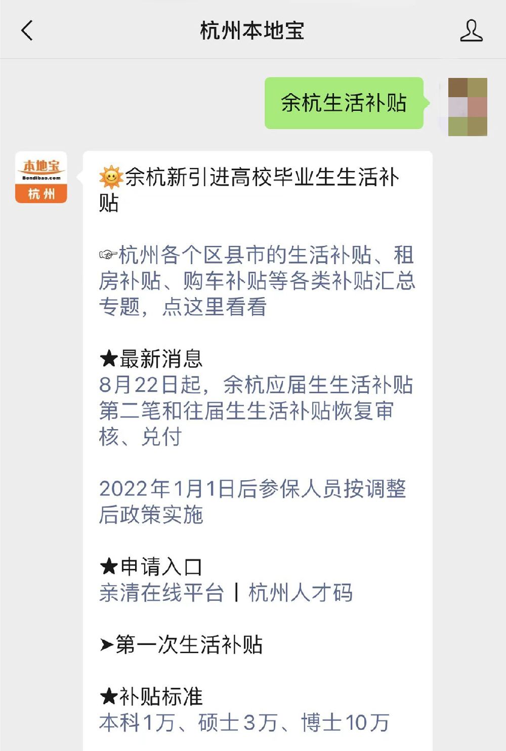 温馨提示:微信搜索并关注【杭州左边本地宝右边】左边公众号右边,回复【余杭生活补贴】可查看余杭再次生活补贴、往届生生活补贴的申请入口、申请流程等内容。