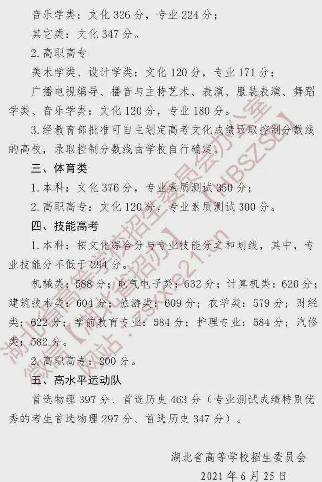 我省2021年普通高等学校艺术体育类专业招生文化成绩录取控制分数线已确定,现公布如下: