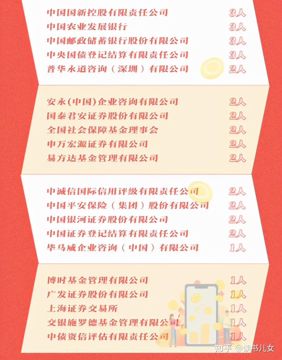10人以上金融类单位有:中国建设银行股份有限公司26人,中国国际金融股份有限公司16人,中信建投证券股份有限公司15人,华泰证券股份有限公司13人,中国工商银行股份有限公司12人,中国进出口银行11人,中国银行股份有限公司10人。