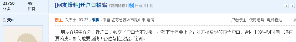 论坛网友“天n”发帖爆料:朋友介绍中介公司迁户口,钱交了户口迁不过来,小孩下半年要上学。对方扯皮说答应迁户口,合同里没注明时间,现在要赖皮。如何能要回钱?各位帮忙支招,谢谢。