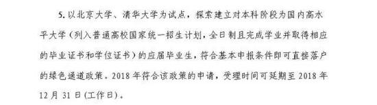 以北京大学、清华大学为试点,探索建立对本科阶段为国内高水平大学(列入普通高校国家统一招生计划,全日制且完成学业并取得相应的毕业证书和学位证书)的应届毕业生,符合基本申报条件即可直接落户的绿色通道政策。2018年符合该政策的申请,受理时间可延期至2018年12月31日。