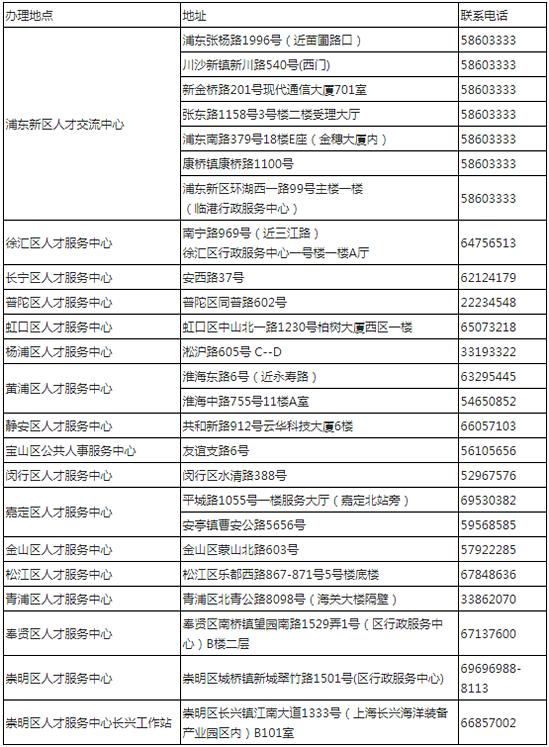 以下是上海市各区受理点地址与电话,这是官方公布的,虽然有些电话很难打通,但号码确实是正确的。比如我住在闵行区,公司在奉贤区,我需要去奉贤区人才服务中心(奉贤区南桥镇望园南路1529弄1号),电话,我打了2天,完全打不通。