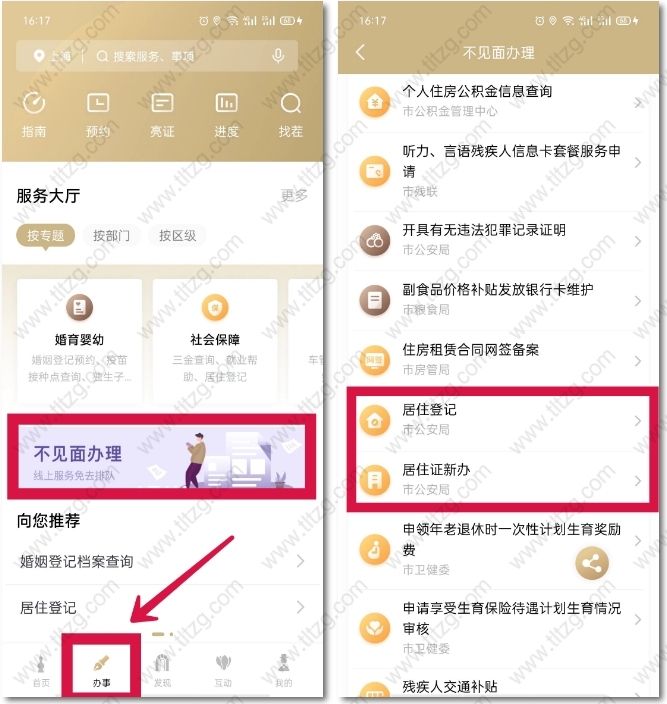 打卡随申办市民云APP,“不见面办理”专栏支持办理【居住登记】、【居住证新办】。