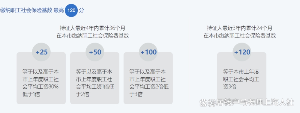 持证人在本市工作缴纳职工社会保险费基数指标最高分值120分。具体积分标准如下: